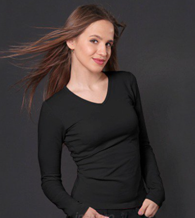 Модель. Приталенный силуэт. Рукав длинный. Футболка имеет боковые швы без разрезов по низу изделия. Обработка горловины руликом (кантом) из основной ткани в цвет футболки или другого цвета. Форма ворота О или V-образная. Возможно бесплатное комбинирование деталей разных цветов (например, рукава могут отличаться по цвету от остальных деталей).